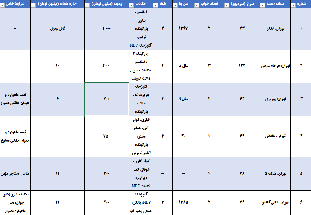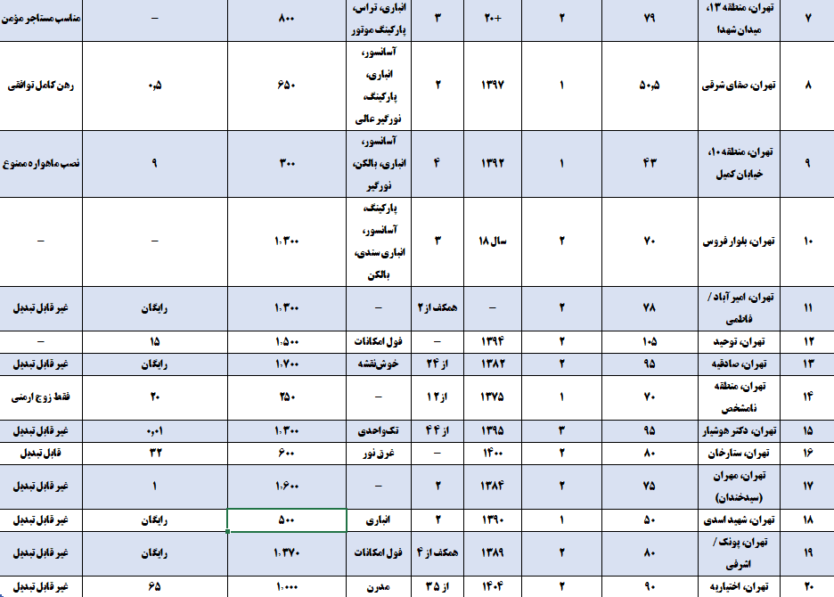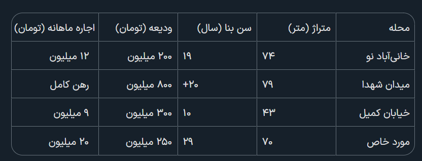 مهران (سیدخندان): واحد ۷۵ متری (۲۰ ساله): ۱ میلیارد و ۶۰۰ میلیون ودیعه و ۱ میلیون اجاره.