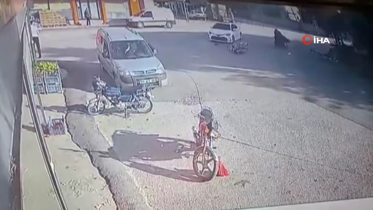 راننده موتورسیکلت که پس از تصادف با خودروی سواری تویوتا، چندین متر به هوا پرتاب شده بود، روی سر یک زوج مسن که در پیاده رو راه میرفتند، سقوط کرد. این تصادف توسط دوربین امنیتی ضبط شده است. منبع: TRT Haber