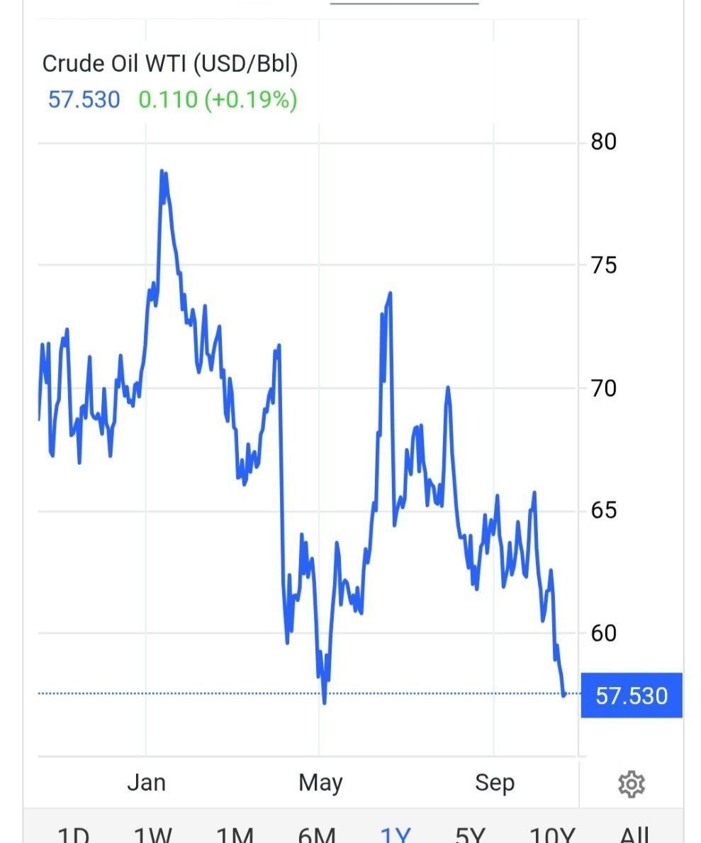 از سوی دیگر، در بازار انرژی نیز نفت برنت با افت مداوم قیمت به کف یکساله خود در محدوده ۵۷ دلار رسید؛ افتی که تحلیلگران آن را ناشی از نگرانی نسبت به کاهش تقاضای جهانی و افزایش ذخایر نفتی میدانند.