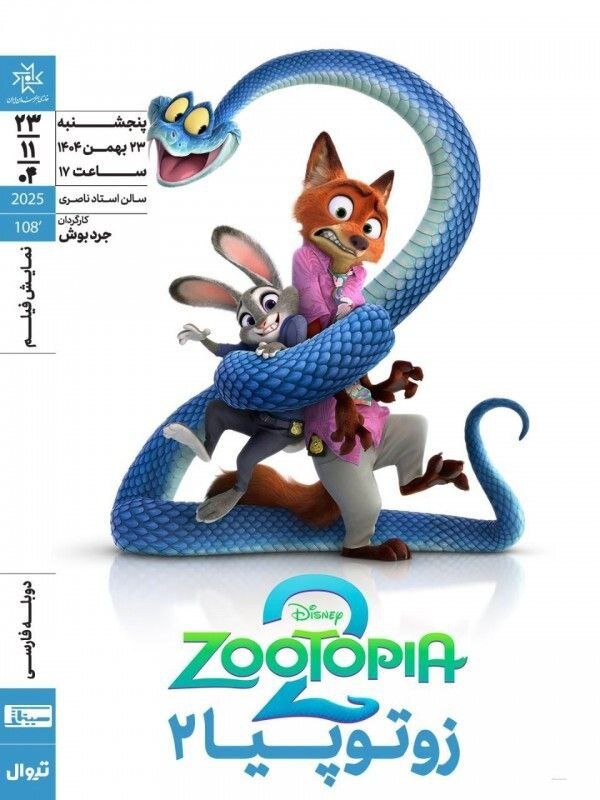 فیلم انیمیشن «زوتوپیا۲» (۲۰۲۵) ساخته جرد بوش، ساعت ۱۷ پنجشنبه ۲۳ بهمن ۱۴۰۴ در سالن استاد ناصری خانه هنرمندان ایران به نمایش درمیآید. منبع | خبرآنلاین