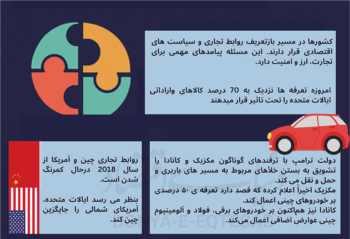 کانادا نیز هماکنون بر خودروهای برقی، فولاد و آلومینیوم چینی عوارض اضافی اعمال میکند. در حال حاضر به نظر میرسد کانادا در حال تلاش برای استفاده از مزیتهای خود در حوزه انرژی و منابع طبیعی برای دستیابی به یک توافق تجاری مطلوب با ایالات متحده است. مکزیک نیز بهدلیل مزیت رقابتی خود در زمینه بهینهسازی هزینهها و نزدیکی به بازار ایالات متحده، میتواند به یکی از مقاصد اصلی سرمایهگذاری خارجی تبدیل شود.